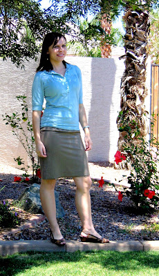 These pics are just glorious. Your blue top, the latte skirt and the greenery and red around you come together so well. Great job!